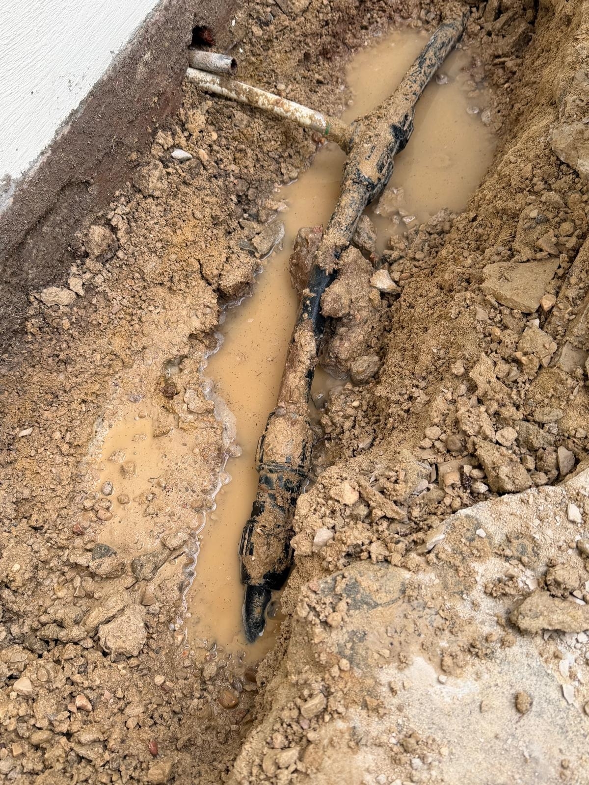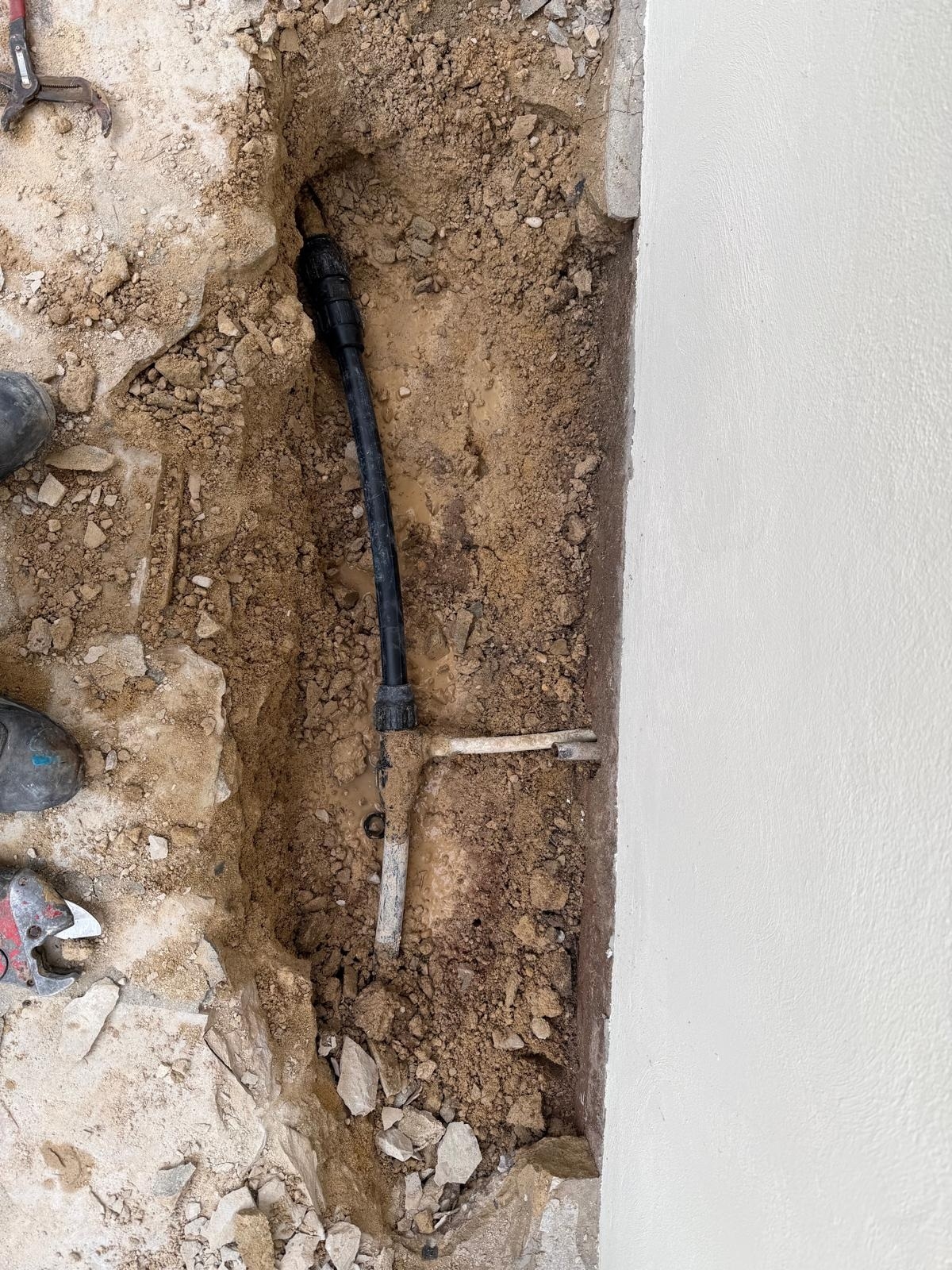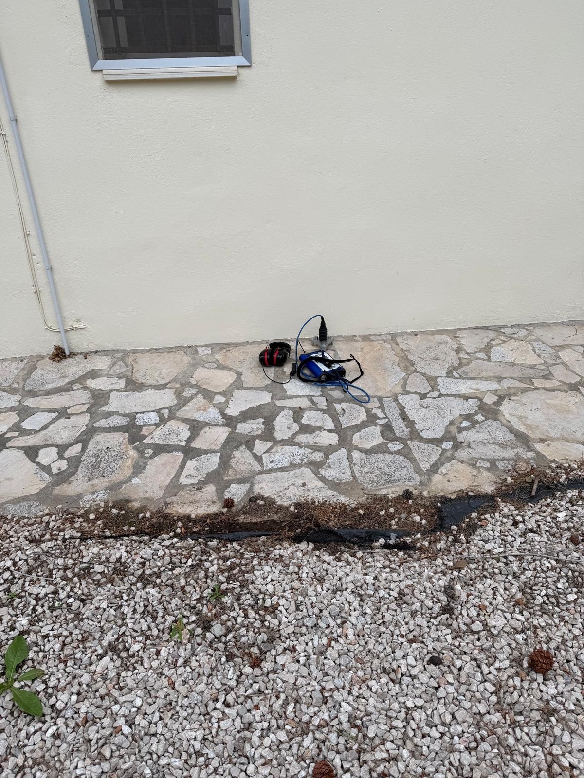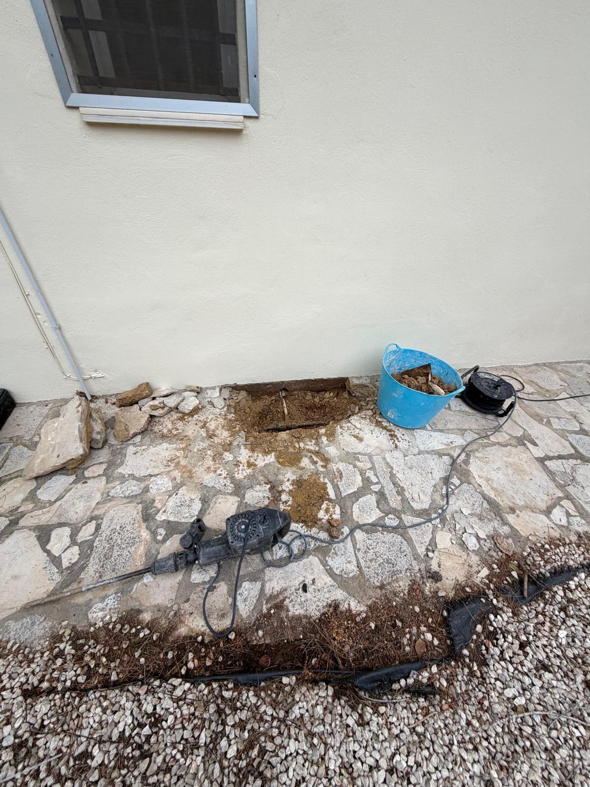 Gracias a nuestro equipo de geófono y gas trazador, pudimos localizar el punto exacto de la rotura bajo el pavimento sin tener que levantar todo el jardín. Como veis en las fotos, abrimos solo donde era necesario para reparar la tubería de polietileno.